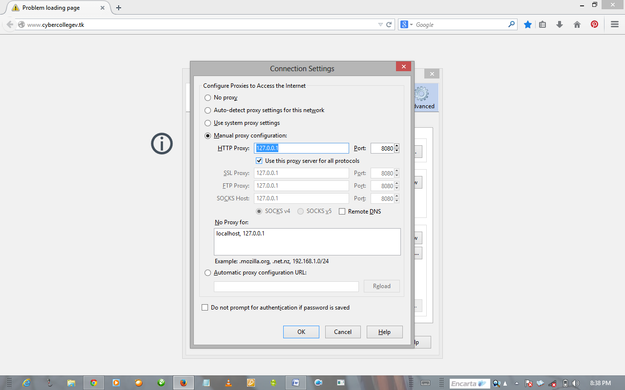 ^^Open your Mozilla click on the menu, followed by options>>click on advanced>>> click on networks and select settings on the left side of connection title as shown below, after that a prompt will come up just check Manual Configuration and fill in the below